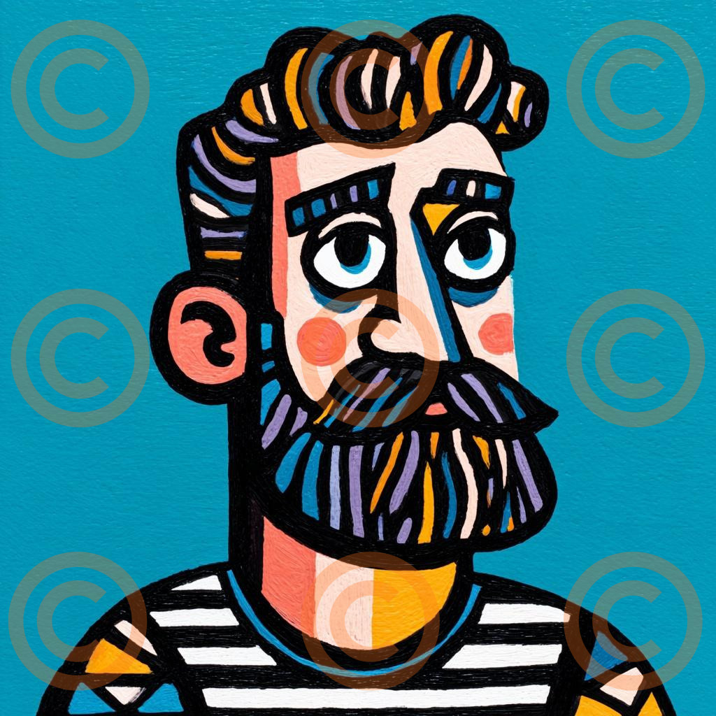 “Charlie” is a lively geometric portrait bursting with charm and colour. The artwork blends thick graphic linework with vibrant block tones — including teal, peach, lilac, mustard and deep blues — giving it a playful yet contemporary feel. The expressive eyes, textured beard and striped clothing add lovely character, making this a standout piece for anyone who enjoys modern, design-led illustration.