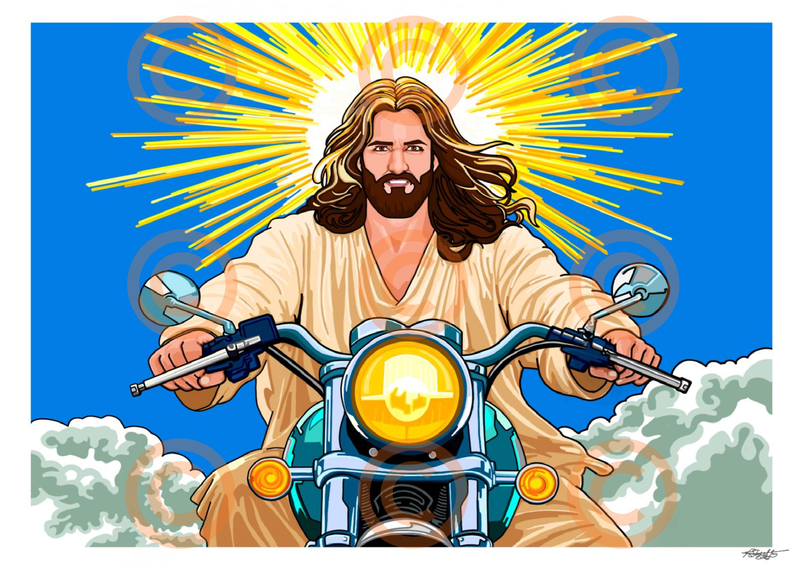 Bring bold, uplifting energy to your space with this vibrant illustration featuring a serene, long-haired, bearded figure riding a classic motorcycle through bright blue skies. Behind him, an explosive golden halo radiates outward, creating a powerful sense of motion, divinity, and freedom.