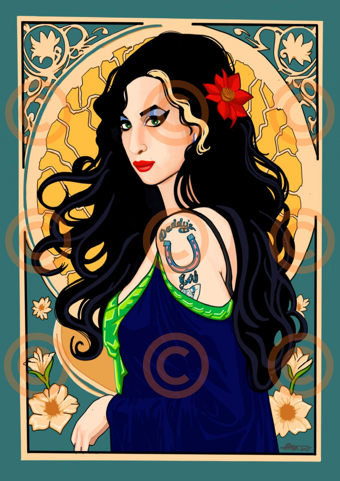 The rich teal, gold, and cream palette gives the piece a warm, timeless feel, while the ornate circular backdrop and botanical detailing add depth and sophistication. Her detailed shoulder tattoo and draped blue garment introduce a modern edge, creating a unique fusion of old-world charm and present-day artistry.