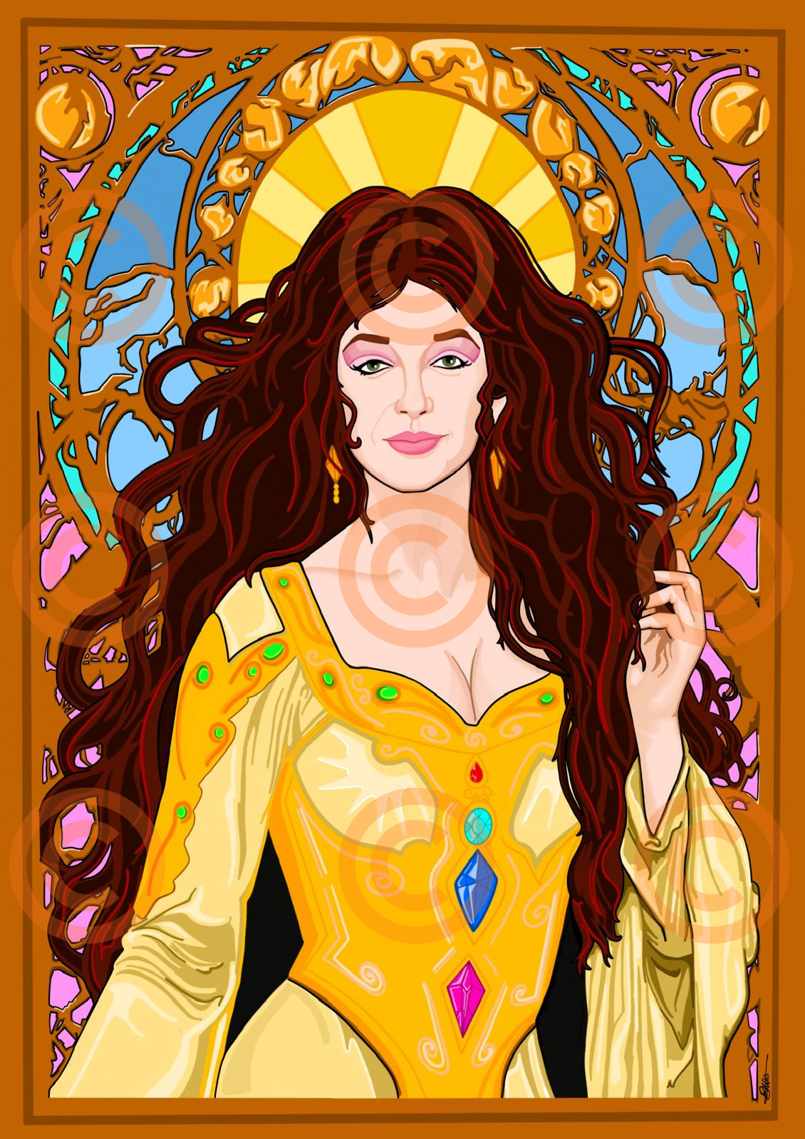Illuminate your space with this radiant Art Nouveau–inspired portrait print. The artwork features an elegant enchantress dressed in flowing golden robes adorned with bright gemstone-like details in shades of aqua, rose, and sapphire. Her long, wavy auburn hair frames a serene, confident expression, while a warm sunburst halo glows behind her, adding a divine and luminous quality.