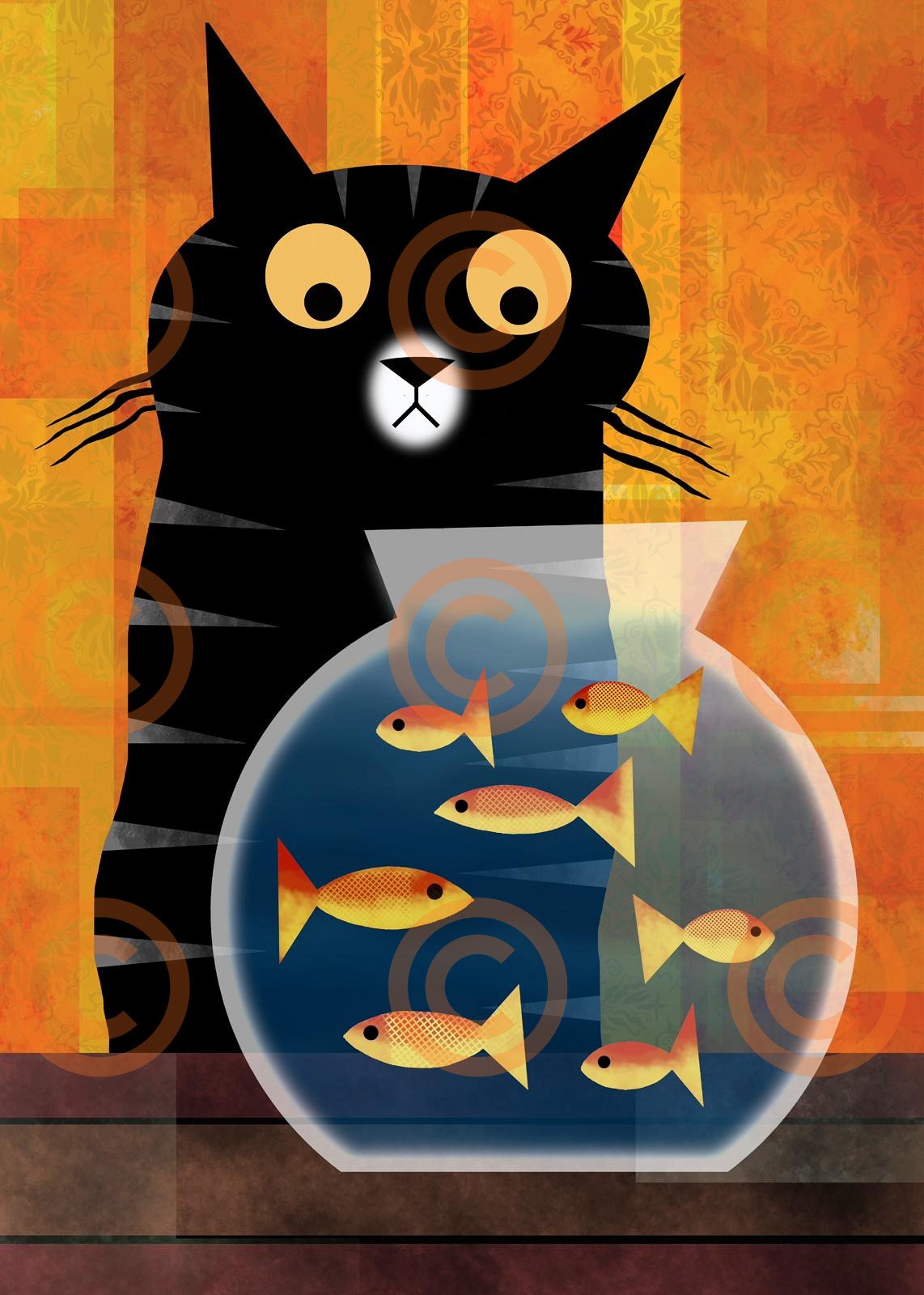 Bring a delightful splash of colour and personality to your home with this playful retro-style illustration. The artwork features a wide-eyed black cat staring intently at a fishbowl filled with bright orange and yellow fish. Its comically stunned expression contrasts beautifully with the richly textured orange background, creating a fun and eye-catching centrepiece for any room.
