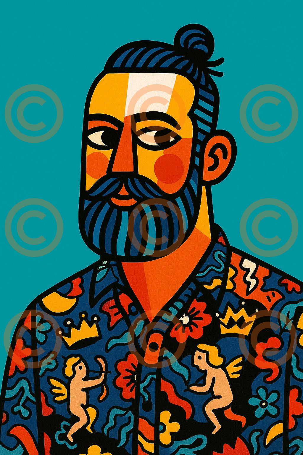 Bring a splash of colour and personality to your space with this striking illustrated portrait. The artwork features a stylised male figure with a rich blue beard and top knot, dressed in a lively patterned shirt adorned with playful motifs such as floral shapes, crowns, and cherub-like figures. Against a clean teal background, the bold…