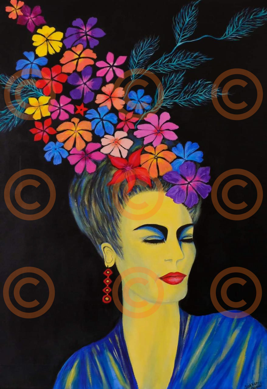 This vibrant portrait of Frida contrasts a serene, yellow-skinned figure with an explosion of multicoloured flowers rising dramatically from her hair. Her closed eyes and poised expression suggest calm introspection, while the bold colours around her pulse with creative energy. The piece blends elegance and surrealism, celebrating imagination, femininity and quiet strength.