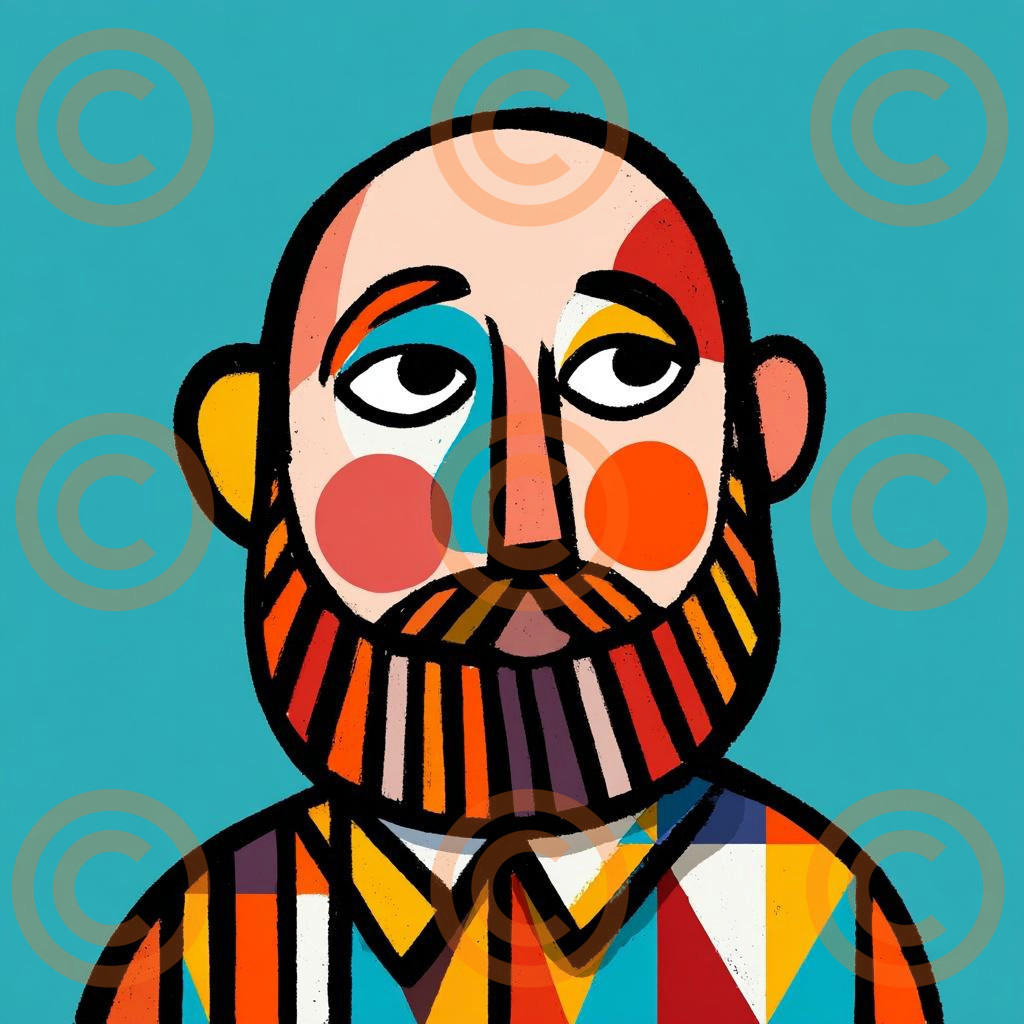 Bring bold colour and personality into your space with this vibrant illustrated portrait. The artwork features a bearded character with a warm, expressive face created using striking colour-block shapes in reds, yellows, blues, and oranges. The crisp black outlines give the piece a clean, graphic feel, while the playful patchwork shirt adds loads of charm.