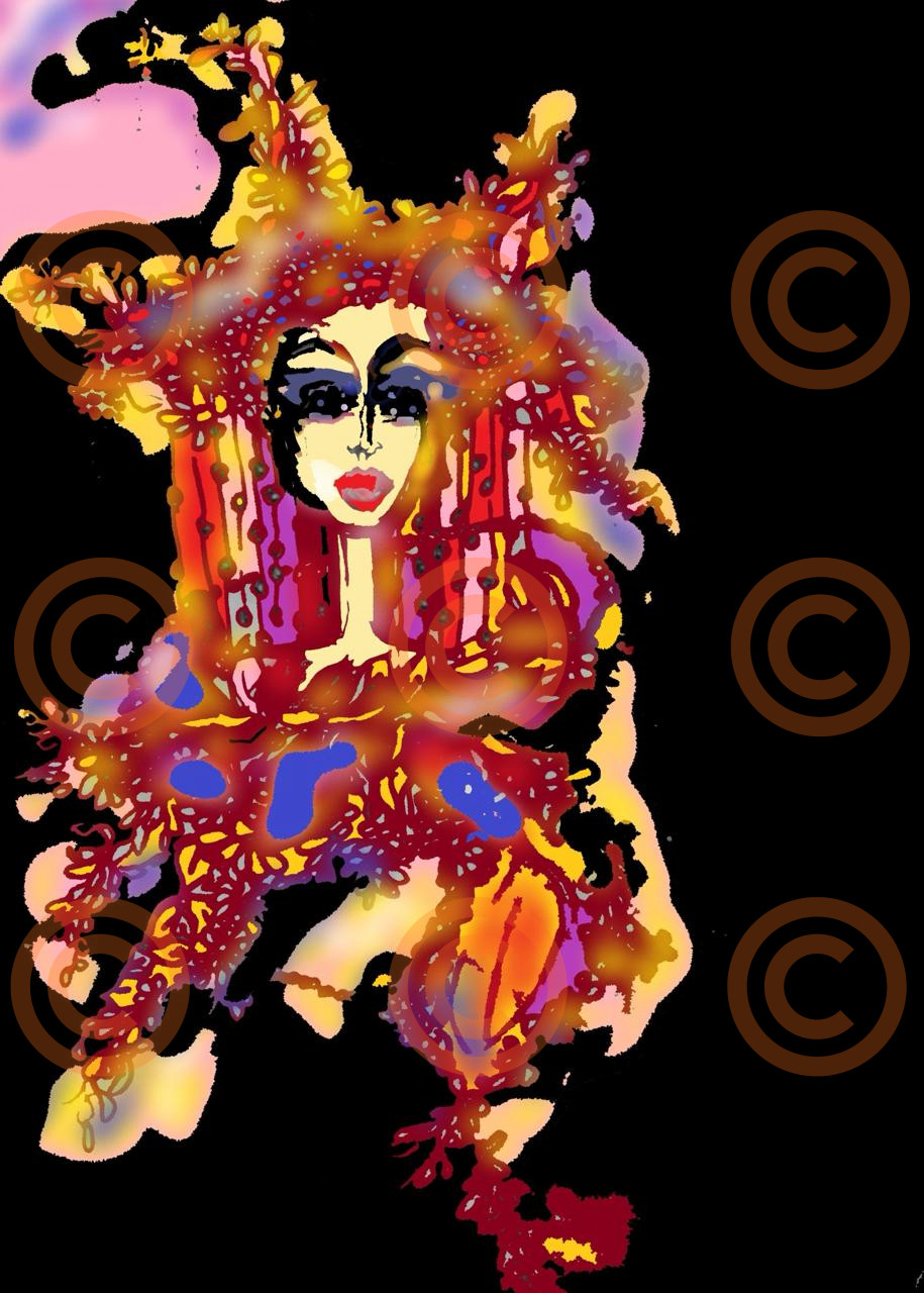 Hunky Dorey: This vivid, abstract portrait features a dramatic, mask-like face emerging from a cascade of molten reds, yellows and purples that ripple like living fire. The figure’s elongated form dissolves into organic, almost coral-like shapes, giving the sense of a creature transforming or blooming mid-motion. Its intense colours and fluid lines create a dreamlike presence that feels both otherworldly and fiercely expressive.