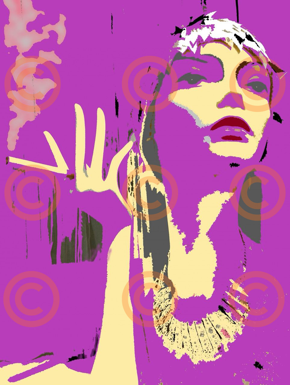 This bold, pop-art style portrait shows a glamorous figure exhaling smoke, her expression cool and untouchable against a vivid magenta backdrop. The flat planes of cream, charcoal and pink give her a stylised, poster-like presence, while her necklace and cigarette holder add a touch of vintage decadence. It’s striking, cinematic and full of attitude — a snapshot of effortless defiance.