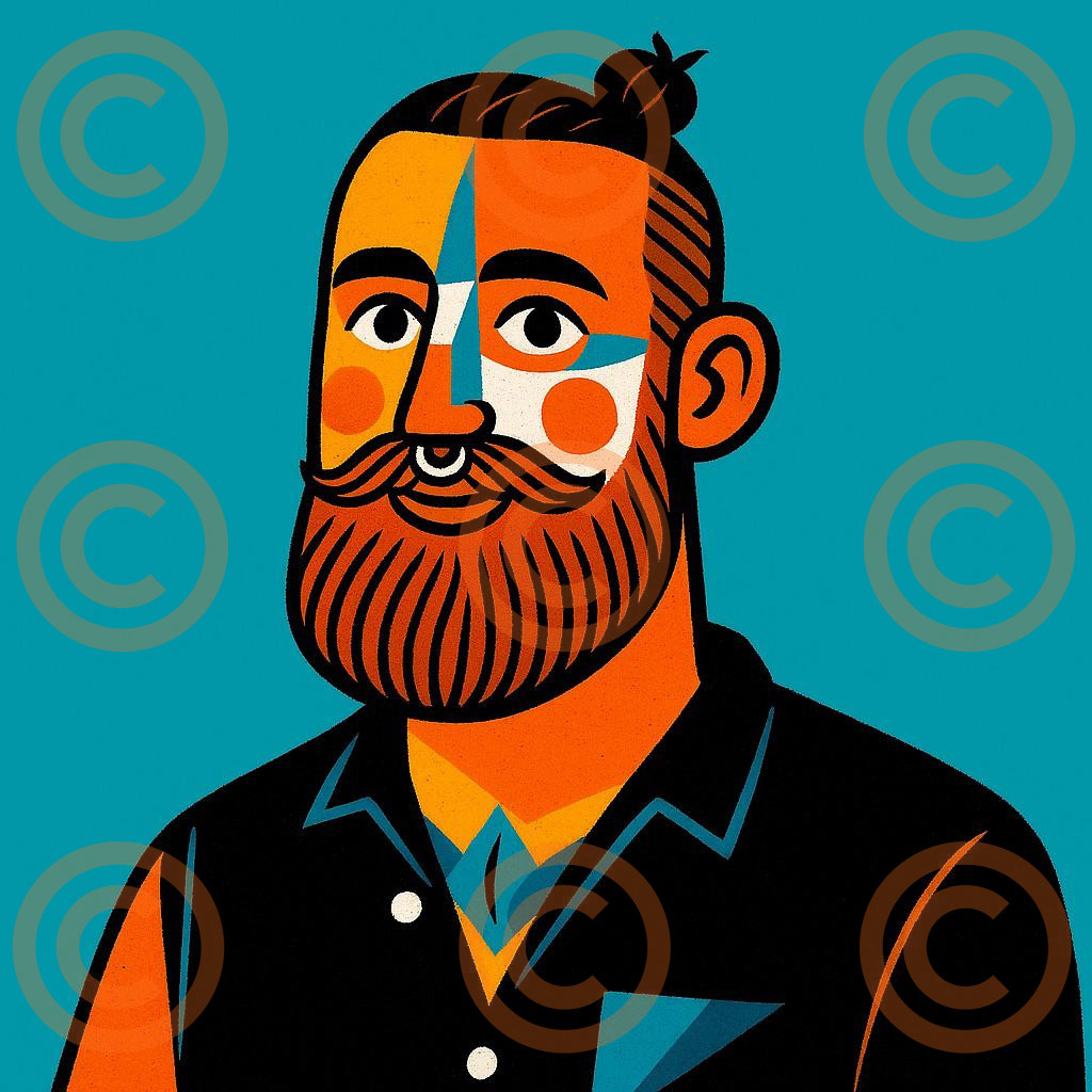 A bold and vibrant contemporary illustration of a bearded man with a warm, confident expression. The piece uses a striking palette of teal, orange, and deep navy, creating a playful yet stylish contrast. His hair is tied in a neat topknot and his beard is rendered in strong graphic lines. Abstract geometric shapes in blue, white, and orange highlight his face, giving the portrait a modern, almost festival-inspired flair. With clean lines, sharp edges, and a flat-colour aesthetic, this artwork feels both retro and fresh — perfect for fans of characterful, design-led portraiture.