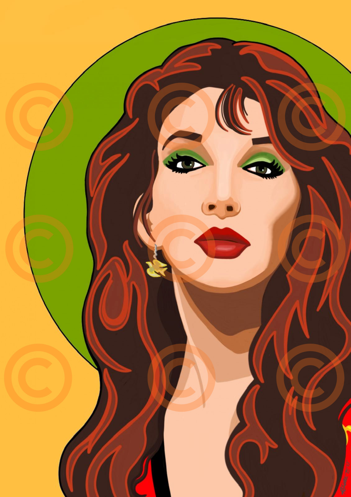 Add striking colour and vintage flair to your décor with this bold retro-inspired portrait print. The artwork features a poised woman with flowing auburn hair, vivid green eyeshadow, and deep red lips, creating a dramatic and expressive focal point. A bright green halo set against a warm golden background gives the piece a radiant, iconic quality, while the stylised linework and saturated tones lend it a modern graphic feel.