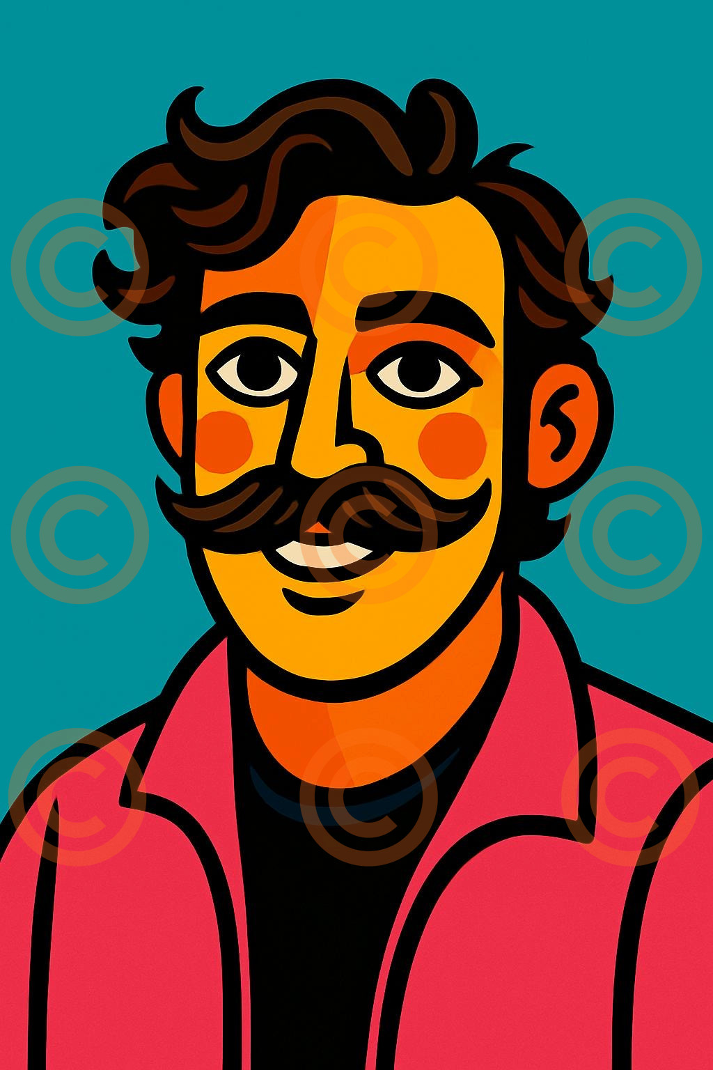 A vibrant, cheeky portrait bursting with colour and confidence, celebrating a proudly queer, moustachioed charmer. This bold digital illustration brings a retro-pop flair and a warm, flirty energy that brightens any space. Perfect for anyone who loves joyful, unapologetically queer art.