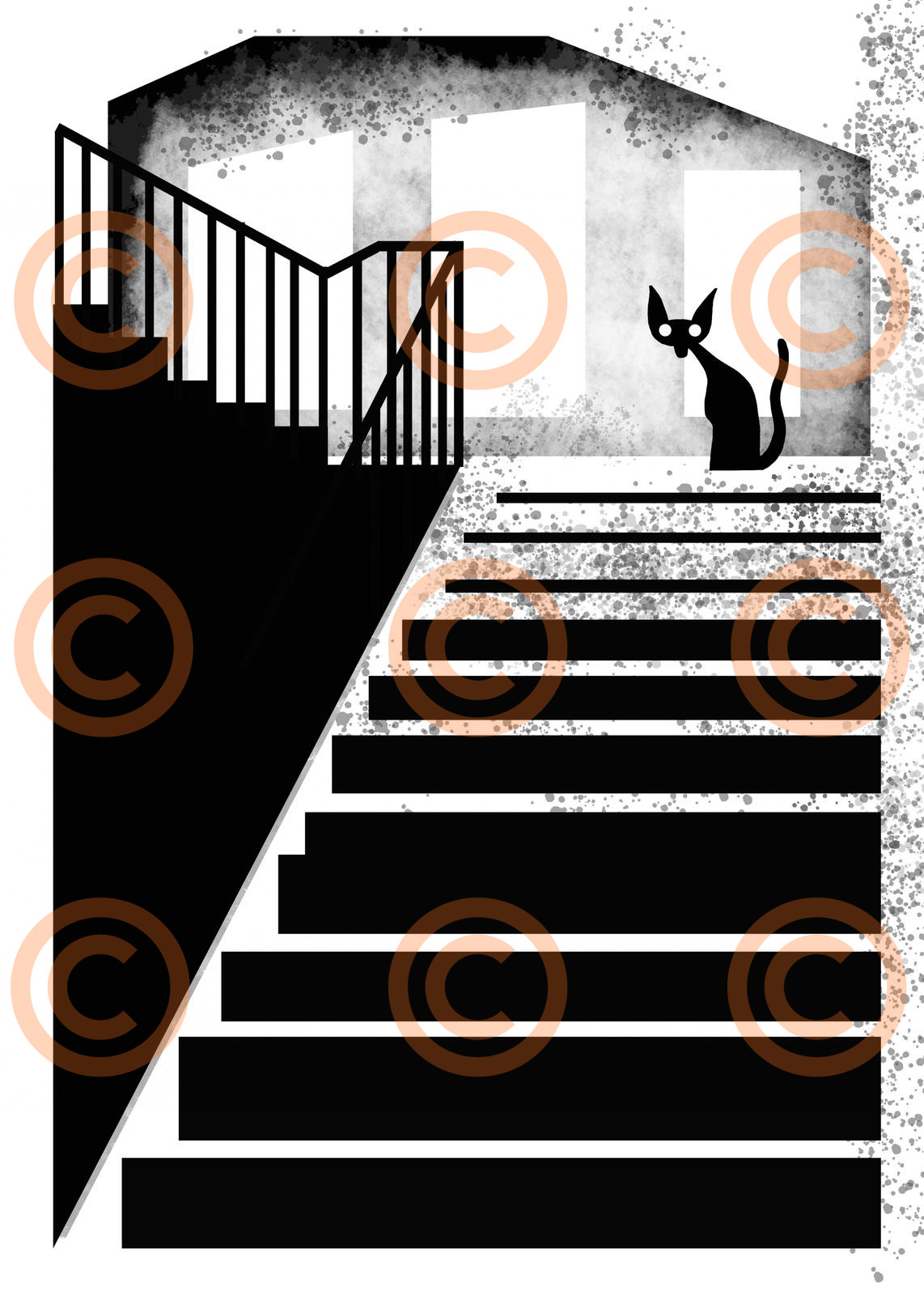 Add a touch of intrigue to your wall décor with this striking black-and-white minimalist illustration. The artwork features a lone black cat perched at the top of a bold, graphic staircase, its bright eyes glowing against the misty, speckled background. Clean architectural lines contrast with soft ink-wash textures, creating a dramatic noir atmosphere that feels both modern and mysterious.