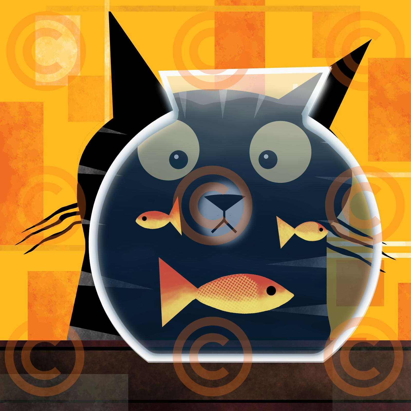 Add a bright splash of humour to your décor with this delightful retro-inspired illustration. The artwork features a wide-eyed black cat peering through a round fishbowl, its face amusingly distorted by the glass as three vibrant orange fish swim across its reflection. Set against a warm yellow geometric background, the piece balances bold shapes with soft textures, creating a fun and eye-catching composition.