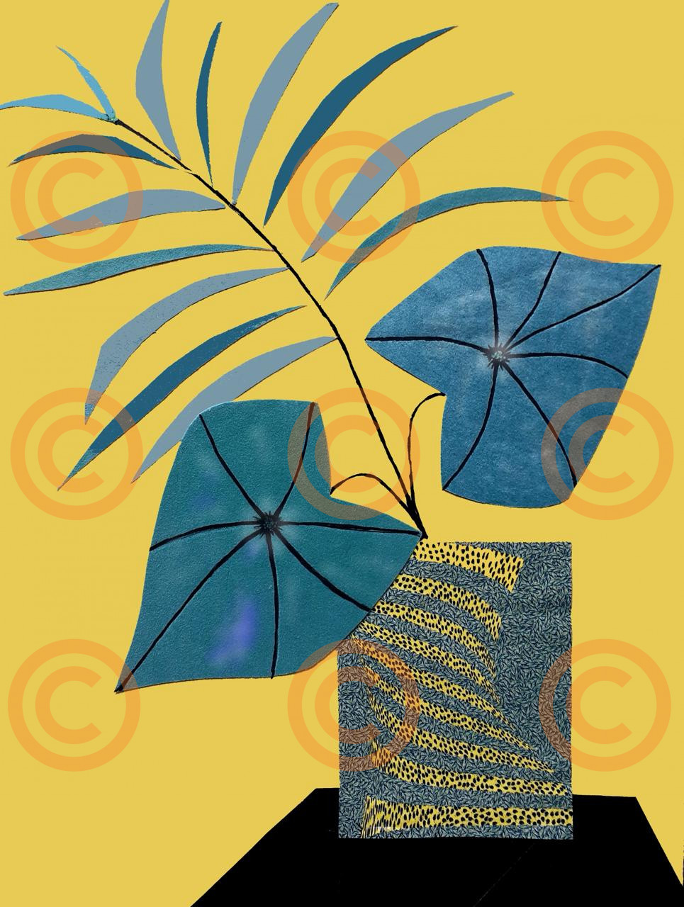This bold, contemporary still life pairs deep teal leaves with a mustard-yellow background, creating a striking sense of contrast and calm. The plant’s elegant, graphic lines sit atop a patterned vase that adds texture and rhythm to the composition. It feels minimal yet expressive, turning a simple houseplant into a quietly stylish design statement.