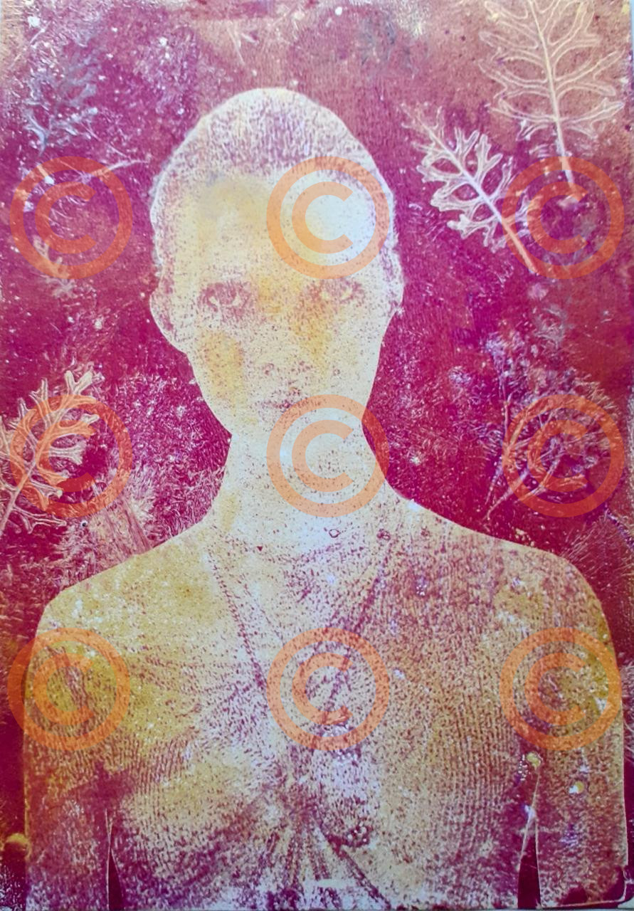 This ethereal print depicts a ghostly, pale figure emerging from a textured wash of pink, gold and soft ochre, as though suspended between presence and memory. Delicate leaf impressions surround the figure like fossilised whispers, giving the piece an organic, almost archaeological quality. The result feels quietly haunting — a portrait that seems to fade and reveal itself at the same time.