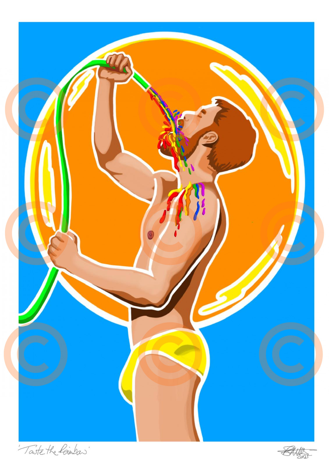 Playful Pop Art Print – “Taste the Rainbow” Bring bold humour and vibrant colour into your space with this playful pop art–inspired illustration. The artwork features a muscular figure in bright yellow swim briefs holding a garden hose, from which a stream of rainbow colours splashes across his face in a dramatic, exaggerated arc. Set…