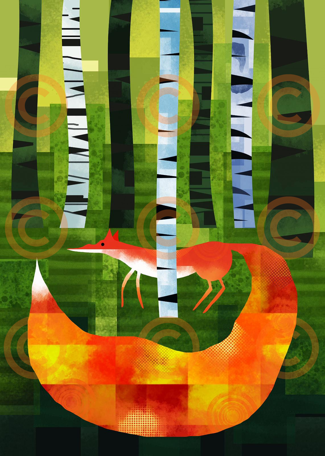 Brighten your space with this striking modern woodland art print. The illustration features a graceful red fox weaving through tall birch trees, its sweeping orange tail curling dramatically across the foreground. The forest is rendered in layered geometric blocks of green, blue, and soft neutrals, giving the scene a textured, abstract quality that feels both contemporary and organic.